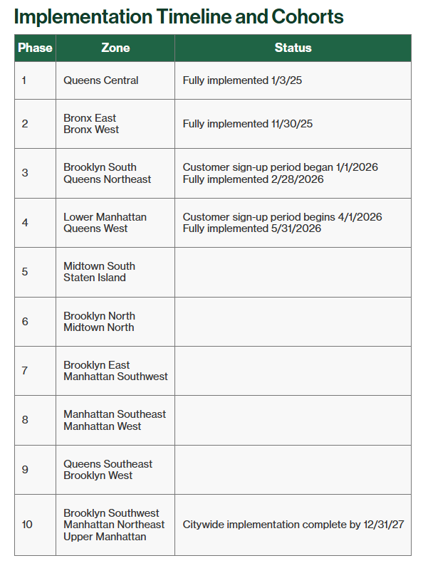 The rollout of these two zones follows Queens Central (fully implemented 1/3/25), Bronx East and Bronx West (fully implemented 11/30/25), and Brooklyn South and Queens Northeast (to be fully implemented 2/28/26).